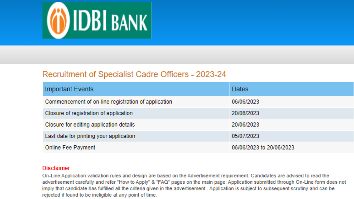 आयडीबीआय बँकेत स्पेशालिस्ट कॅडर ऑफिसर या पदाच्या भरतीसाठी अर्जाची प्रक्रिया सुरू झाली आहे. या पदावर अर्ज करण्यासाठी पात्र आणि इच्छूक उमेदवार अधिकृत वेबसाईटवर ऑनलाईन अर्ज करू शकतात. तसेच अर्ज जमा करण्याची शेवटची तारीख २० जून २०२३ आहे.