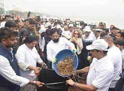मुंबई / आज गिरगाव चौपाटी येथे सागराच्या साक्षीने सुंदर महाराष्ट्राच्या दिशेने एक पाऊल टाकण्यात आले. उत्साही नागरिक, विद्यार्थी यांच्या जोडीने, राज्यपाल रमेश बैस, मुख्यमंत्री एकनाथ शिंदे आणि मान्यवरांनी स्वत: हातात झाडू घेऊन श्रमदान केले आणि स्वच्छतेसाठी ‘एक तारीख एक तास’ या राज्यस्तरीय मोहिमेची सुरुवात केली. सुंदर महाराष्ट्र, सुंदर भारत घडविण्यासाठी आपण टाकलेले हे मोठे पाऊल असून प्रधानमंत्री नरेंद्र मोदी यांच्यामुळे आज स्वच्छतेची ही लोकचळवळ झाली आहे असे यावेळी मुख्यमंत्री एकनाथ शिंदे यांनी माध्यमांशी बोलताना सांगितले. राज्यात शहरी आणि ग्रामीण मिळून ७२ हजारांपेक्षा जास्त ठिकाणी स्वच्छतेची ही मोहीम पार पडली असून त्याबद्धल मुख्यमंत्र्यांनी कौतुक केले.
